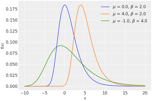 \[f(x \mid \mu, \beta) = \frac{1}{\beta}e^{-(z + e^{-z})}\]