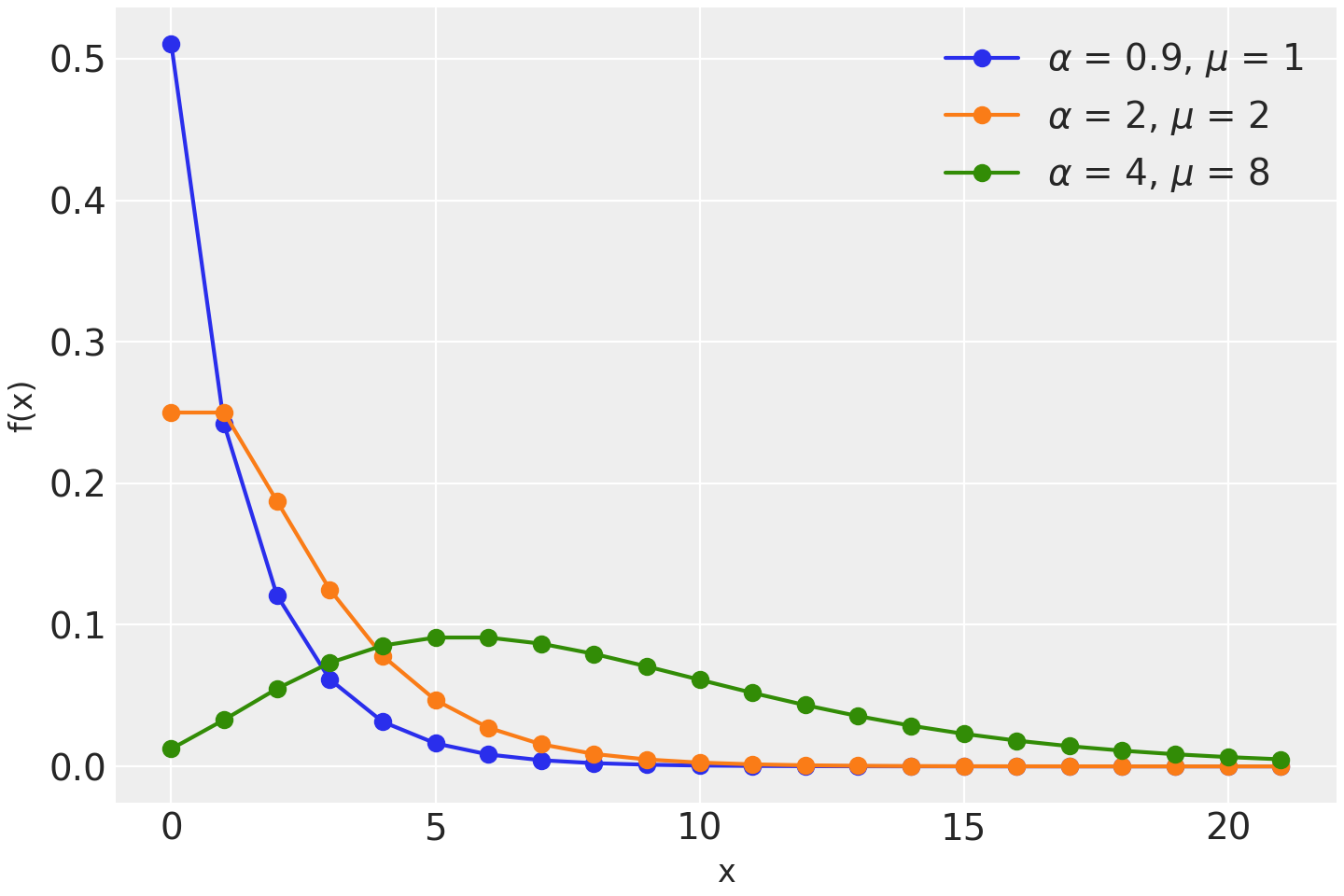\[f(x \mid \mu, \alpha) = \binom{x + \alpha - 1}{x} (\alpha/(\mu+\alpha))^\alpha (\mu/(\mu+\alpha))^x\]