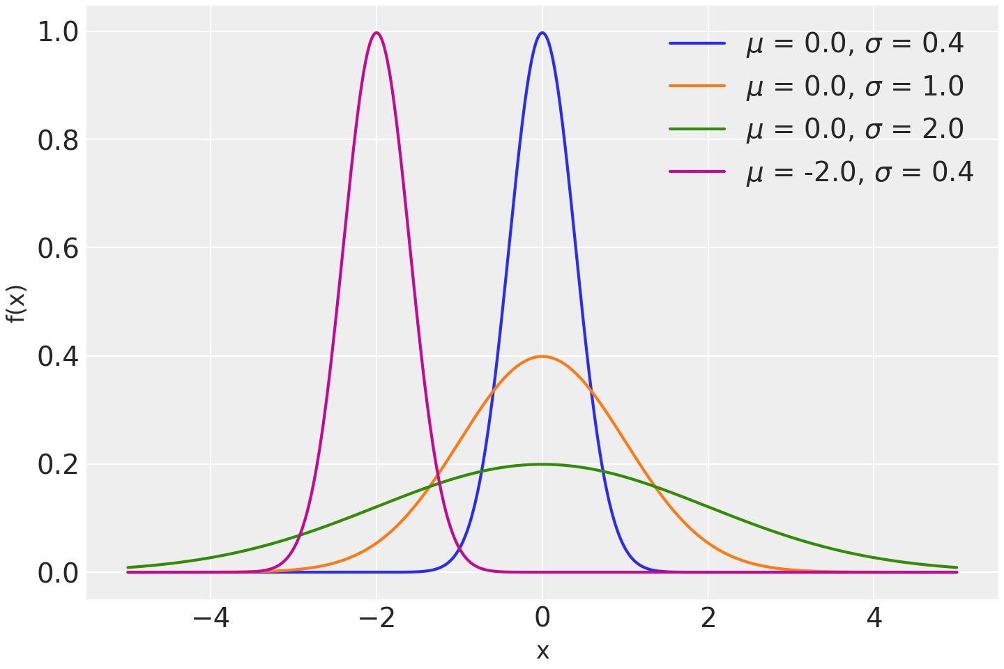 \[f(x \mid \mu, \tau) = \sqrt{\frac{\tau}{2\pi}} \exp\left\{ -\frac{\tau}{2} (x-\mu)^2 \right\}\]